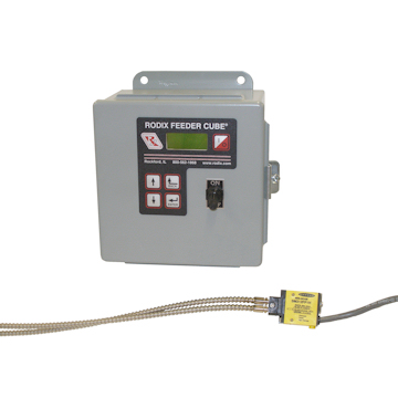The FC-208-5 Feeder Cube® is a Single digital controller with parts sensing, housed in a NEMA-12 oil resistant enclosure with input and output power cords installed (plugs not included). A 111-500 fiber optic sensor is installed and (2) 111-31 fiber optic cables are included. Input voltage is 240 VAC, 50/60 Hz. Fused for 8 amps.