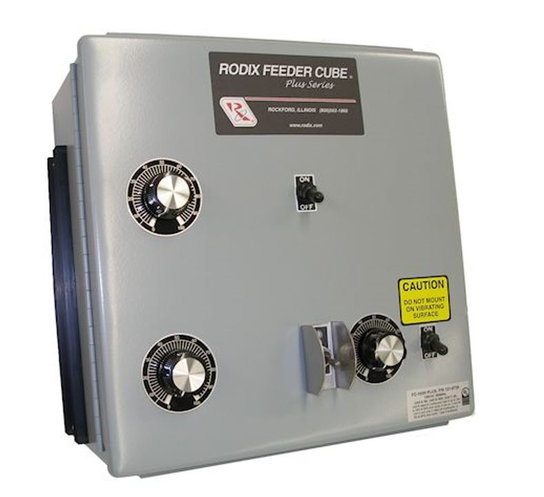 The FC-91-3H Plus Feeder Cube® is a triple heavy-duty controller with three parts sensing units housed in a NEMA-12 oil resistant enclosure. Input voltage is 120 VAC, 50/60 Hz. Units A and C are fused for 5 amps; Unit B is fused for 30 amps.