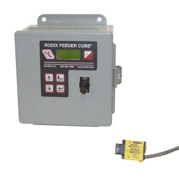 The FC-208-4 Feeder Cube® is a digital Single controller with parts sensing, housed in a NEMA-12 oil resistant enclosure with a 111-500 fiber optic sensor installed. Input voltage is 240 VAC, 50/60 Hz. Fused for 8 amps.