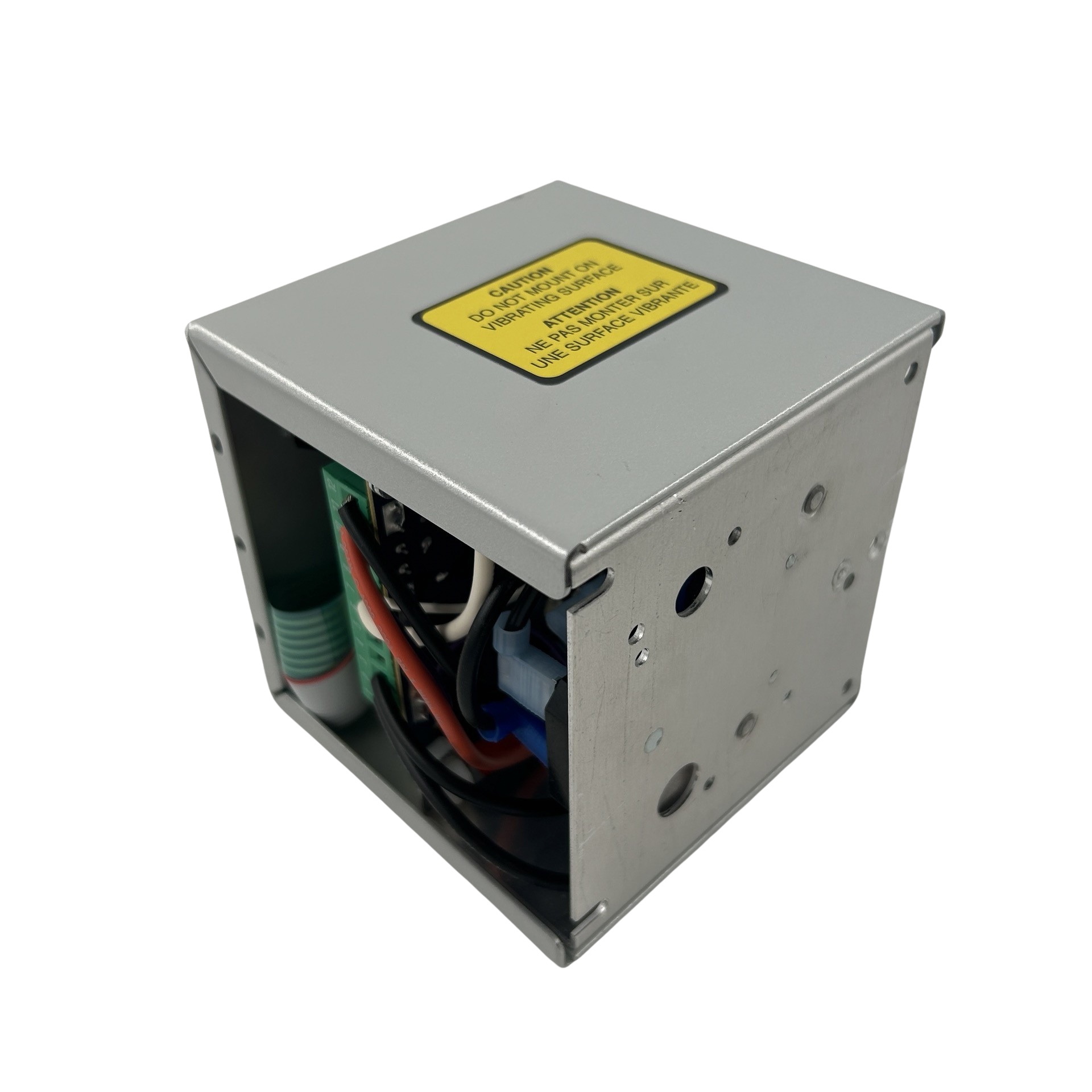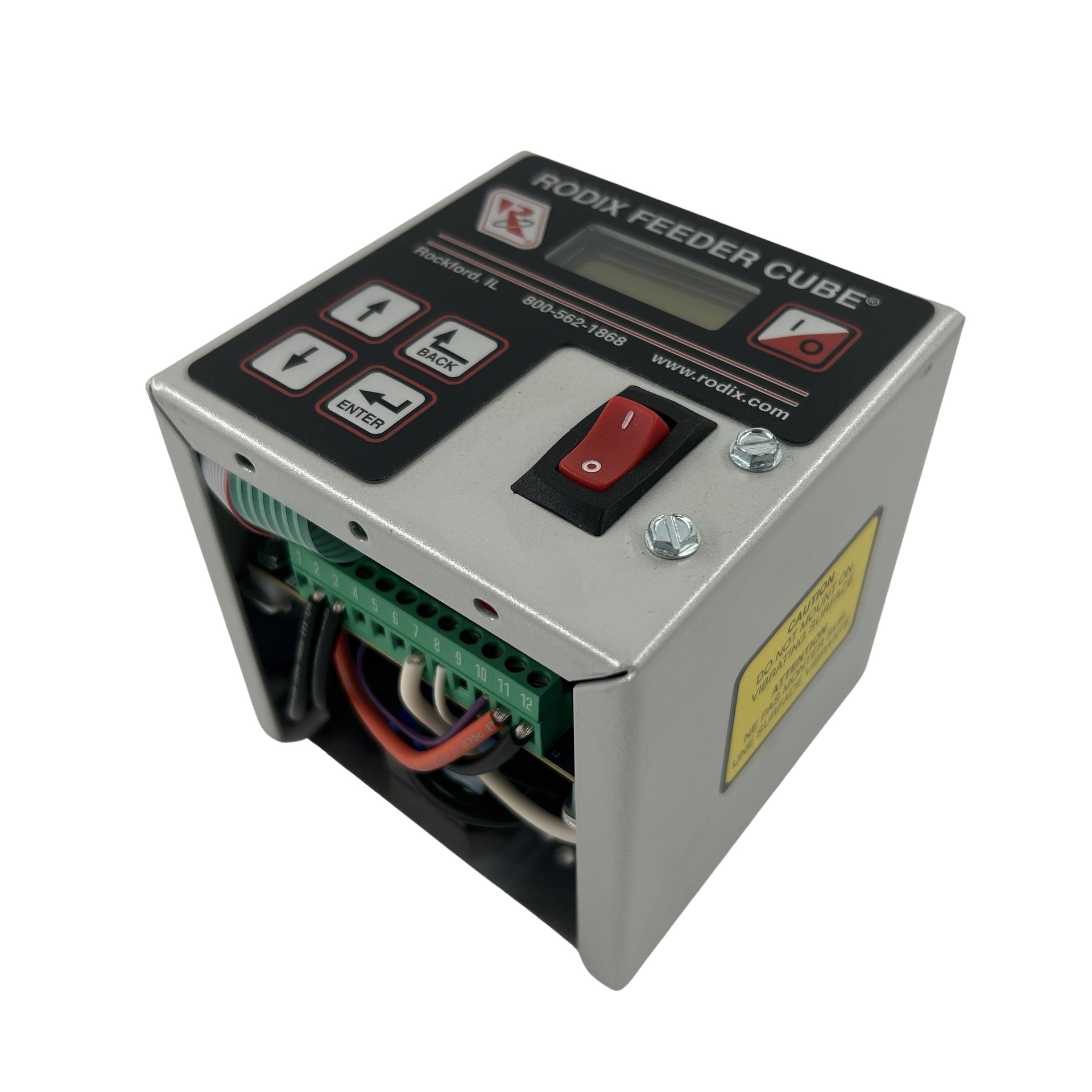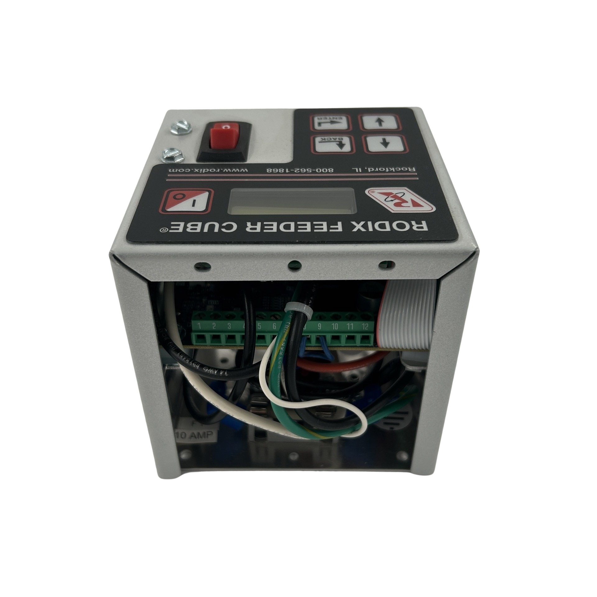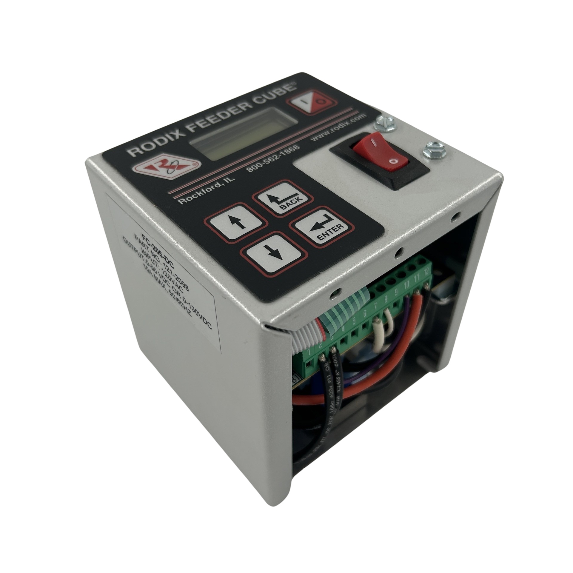 The FC-205-DC Feeder Cube® is a Single 200 Series digital control designed for mounting inside a larger cabinet on the subpanel. The sides are open for easy access to the terminal strips for applying power and sensors. Input voltage is 120 VAC and the unit is fused for 10 amps. Output type is DC for Brushed DC