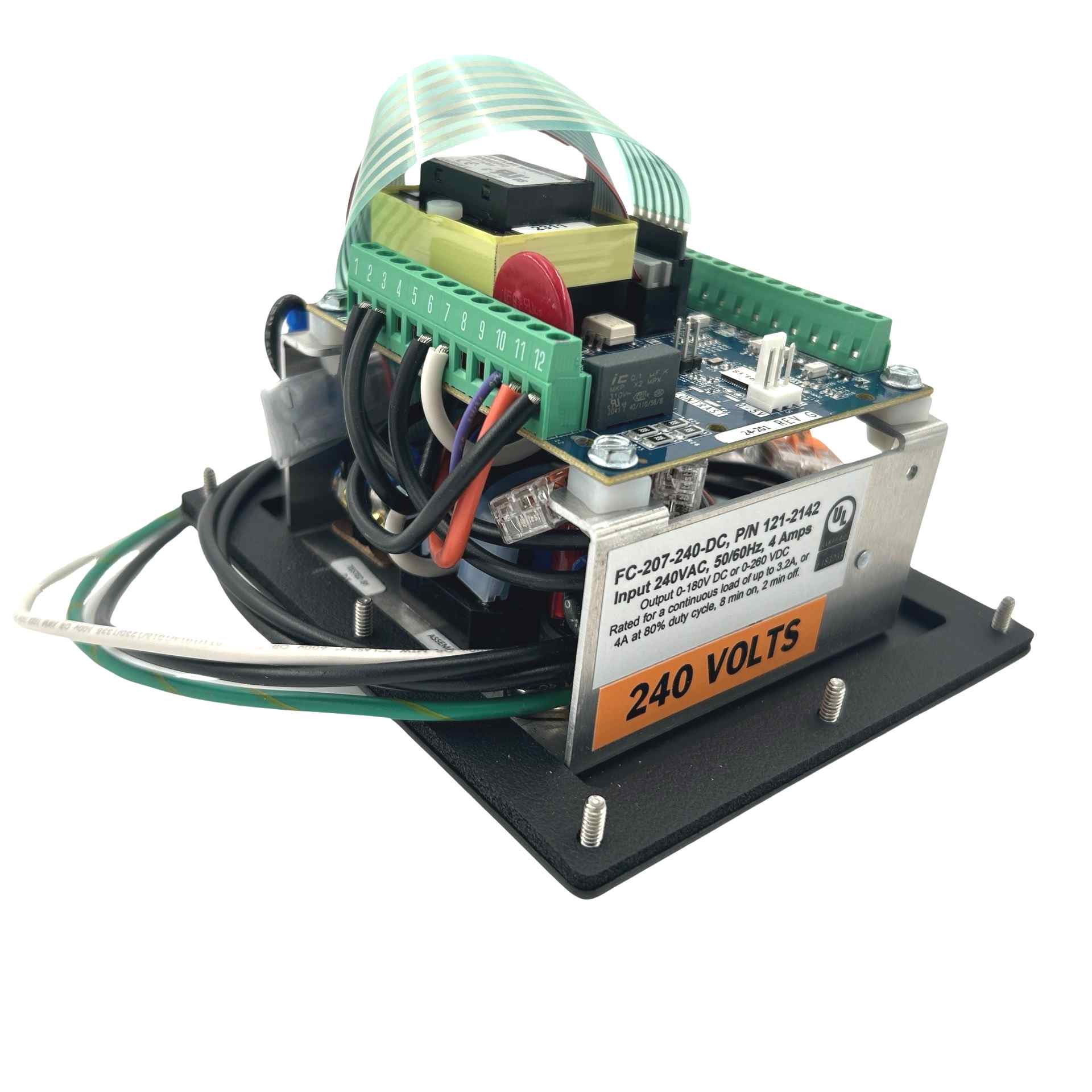 The FC-207-240-DC Feeder Cube® was designed for installing the controller into the door or panel face of a larger enclosure. Along with the FC-207-240-DC motor controller is a closed cell gasket around the plate, mounting hardware, and cutout dimensions for fitting the controller into your panel or door. The face plate is powder coated steel with SS threaded fasteners for a high degree of environmental protection (Nema-4). Input voltage is 240 VAC and the unit is fused for 4 amps. Output type is DC for Brushed DC conveyors/motors.