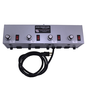 The FC-40-90-40-40 Plus Feeder Cube® is a quad controller in a General Purpose enclosure. Units A, C and D are based on the FC-40 Plus Series and Unit B is an FC-90 Plus Series controller. Input voltage is 120 VAC, 50/60 Hz. Unit A is fused for 5 amps, Unit B is fused for 8 amps and Units C & D are fused for 1 amp.