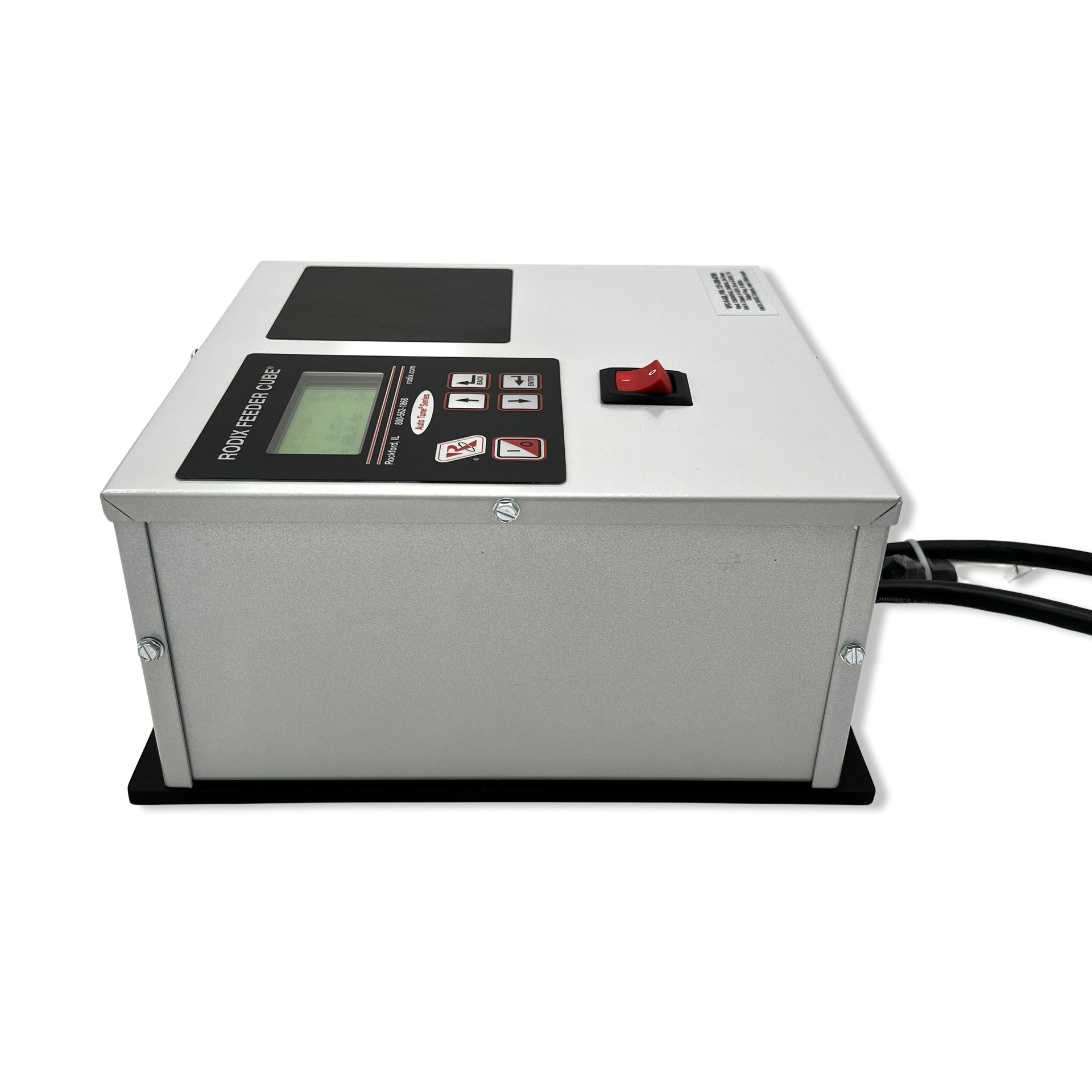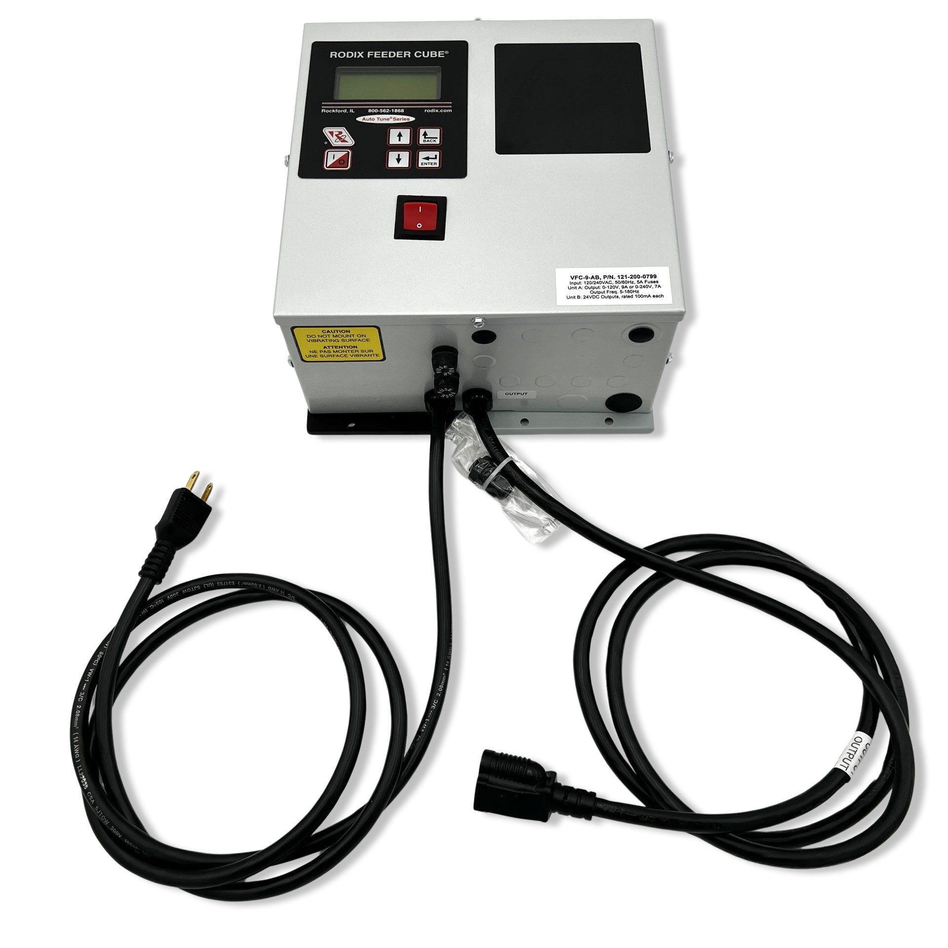 The VF-9-AB Feeder Cube® is a Single variable frequency controller in a NEMA-1 General Purpose. It also includes an Air Blow (AB) controller for multi-lane feeder bowl applications to blow excess parts on a lane back into bowl. Input voltage is 85-264 VAC, 50/60 Hz and fused for 5 amps. Output voltage is 0-120/240 VAC. Output frequency is 5-180 Hz. Rated output current is 9 Amps at 120 VAC or 7 Amps at 240 VAC.