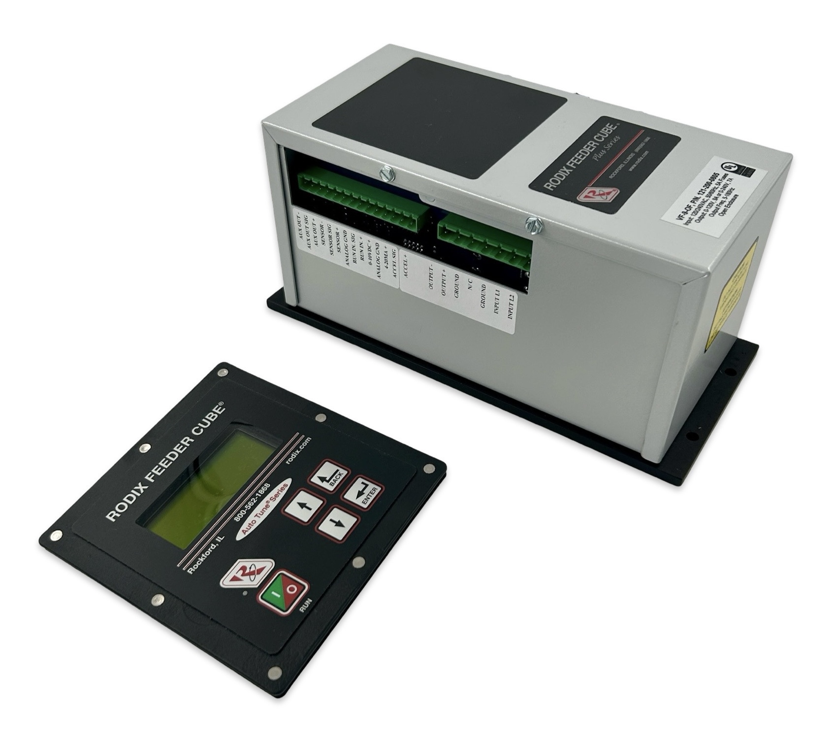 The VF-3-OF-RD (open frame, remote display) AUTO TUNE® Feeder Cube® is a Variable Frequency controller with the control section in an open frame style enclosure for mounting on a subpanel, with the LCD Display panel seperate to allow for a door mounted display in the same enclosure. All mounting hardware for the display panel is included. The input voltage is 85-264 VAC, 50/60 Hz and fused for 5 amps. Output voltage is 0-120/240 VAC. Output frequency is 5-180 Hz. Rated output current is 3 Amps at 120 VAC or 2 Amps at 240 VAC. Vibration sensor sold separately, see part number 123-000-0215.