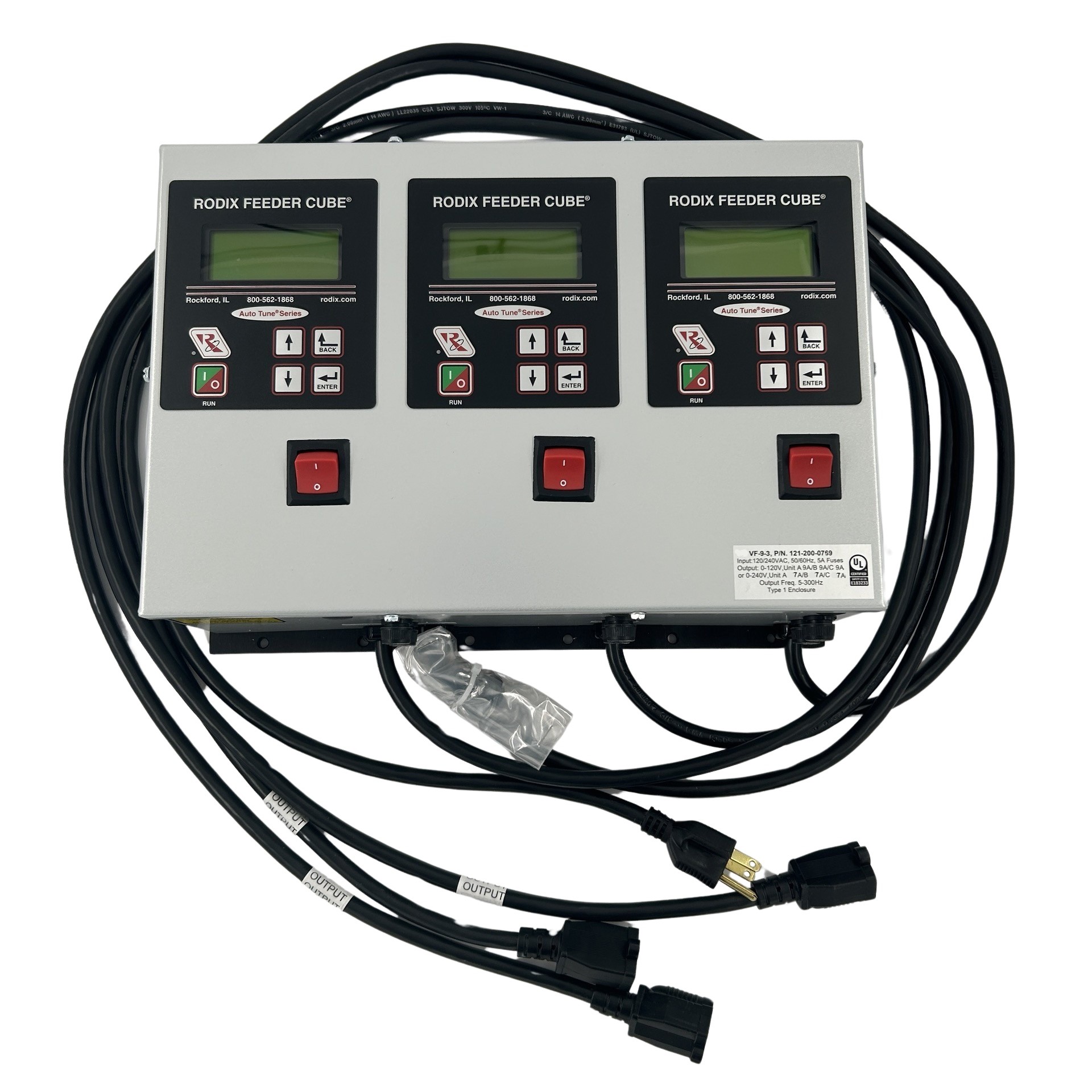 The VF-9-3 AUTO TUNE® Feeder Cube® is a triple controller with three variable frequency units in a NEMA-1 General Purpose enclosure. UL listed (File E183233). Input voltage for units A, B and C is 85-264 VAC, 50/60 Hz and fused for 5 Amps each. The output voltage for each unit is 0-120/240 VAC. The output frequency for each unit is 5-180 Hz. The rated output current of each unit is 9 Amps at 120 VAC or 4.5 Amps at 240 VAC. Vibration sensor kit 123-000-0215 sold separately.